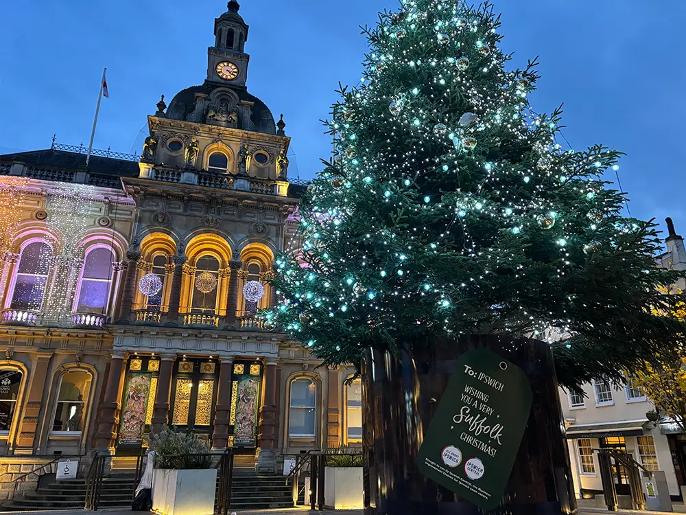 Ipswich Central has for many years provided the giant Christmas Tree which stands proudly every Christmas outside the Town Hall. This 40 to 50ft real Christmas tree costs many thousands of pounds to put in place, including transport, lifting into place and decorations but is so appreciated by the town.