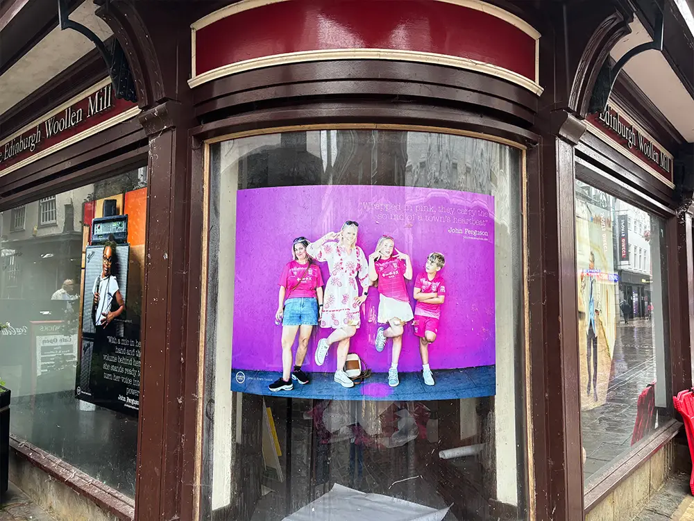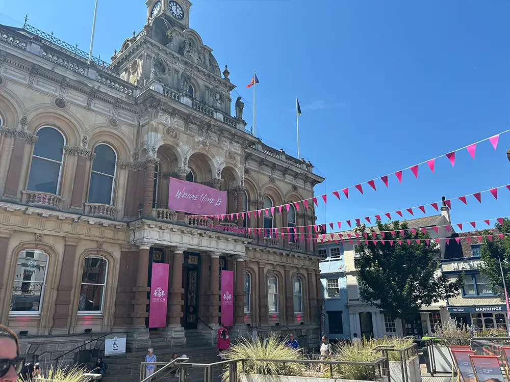 In July 2025, Ipswich Central, using the All About Ipswich brand, turned the town pink to ‘Welcome Home Ed’ as Ed Sheeran performed three concerts at Portman Road Football Stadium, home of Ipswich Town Football Club. 90,000 fans visited the town from all over the world so the town was covered in pink bunting, shop windows decorated with pink displays, hundreds of posters were put up around the town centre, and a pink plaque trail to highlight places associated with Ed Sheeran were put in place, plus many buildings lit themselves pink!